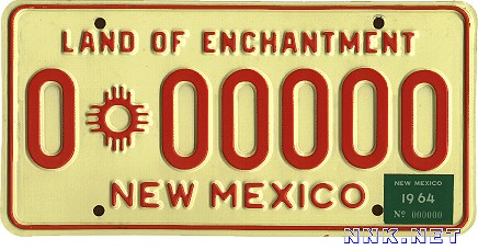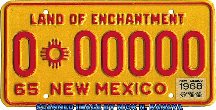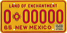 REFERENCE NUMBER: NM-1965FIRST YEAR OF ISSUE: 1964 PLATE TYPE: GENERAL ISSUE BASE MATERIAL: STEEL REFLECTORIZATION: PARTIAL - BACKGROUND ONLY VALIDATION: 1 DECAL ON THE PLATE NOTES: RED SERIAL ON REFLECTIVE YELLOW BASE
