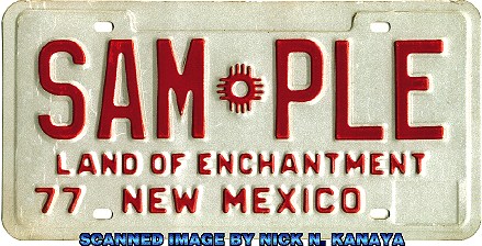 REFERENCE NUMBER: NM-1977ND-1FIRST YEAR OF ISSUE: 1976 PLATE TYPE: GENERAL ISSUE BASE MATERIAL: ALUMINUM REFLECTORIZATION: PARTIAL - BACKGROUND ONLY VALIDATION: 1 DECAL ON THE PLATE NOTES: RED SERIAL ON REFLECTIVE WHITE BASE