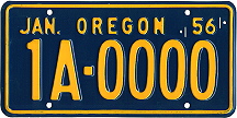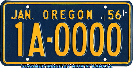 REFERENCE NUMBER: OR-1956FIRST YEAR OF ISSUE: 1955 PLATE TYPE: GENERAL ISSUE BASE MATERIAL: ALUMINUM REFLECTORIZATION: NON-REFLECTIVE VALIDATION: METAL TAB USED ON EACH PLATE (1957-1960) NOTES: YELLOW SERIAL ON BLUE BASE