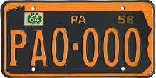 REFERENCE NUMBER: PA-1958FIRST YEAR OF ISSUE: 1958 PLATE TYPE: GENERAL ISSUE BASE MATERIAL: ALUMINUM REFLECTORIZATION: NON-REFLECTIVE VALIDATION: 1 DECAL ON THE PLATE (1959-) NOTES: YELLOW-ORANGE SERIAL ON DARK BLUE BASE