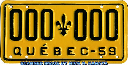 REFERENCE NUMBER: QC-1959FIRST YEAR OF ISSUE: 1958 PLATE TYPE: GENERAL ISSUE BASE MATERIAL: ALUMINUM REFLECTORIZATION: NON-REFLECTIVE VALIDATION: NO DECALS USED ON PLATE NOTES: BLACK SERIAL ON YELLOW BASE