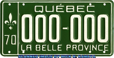 REFERENCE NUMBER: QC-1970FIRST YEAR OF ISSUE: 1969 PLATE TYPE: GENERAL ISSUE BASE MATERIAL: ALUMINUM REFLECTORIZATION: NON-REFLECTIVE VALIDATION: NO DECALS USED ON PLATE NOTES: WHITE SERIAL ON GREEN BASE