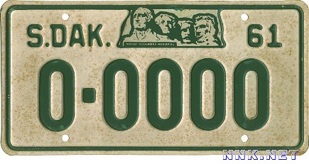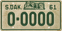 REFERENCE NUMBER: SD-1961FIRST YEAR OF ISSUE: 1961 PLATE TYPE: GENERAL ISSUE BASE MATERIAL: STEEL REFLECTORIZATION: PARTIAL - BACKGROUND ONLY VALIDATION: NO DECALS USED ON PLATE NOTES: GREEN SERIAL ON REFLECTIVE WHITE BASE