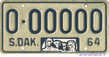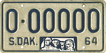 REFERENCE NUMBER: SD-1964FIRST YEAR OF ISSUE: 1964 PLATE TYPE: GENERAL ISSUE BASE MATERIAL: STEEL REFLECTORIZATION: PARTIAL - BACKGROUND ONLY VALIDATION: NO DECALS USED ON PLATE NOTES: BLUE SERIAL ON REFLECTIVE WHITE BASE