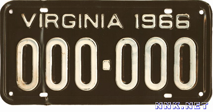 REFERENCE NUMBER: VA-1966FIRST YEAR OF ISSUE: 1966 PLATE TYPE: GENERAL ISSUE BASE MATERIAL: STEEL REFLECTORIZATION: NON-REFLECTIVE VALIDATION: NO DECALS USED ON PLATE NOTES: WHITE SERIAL ON BLACK BASE