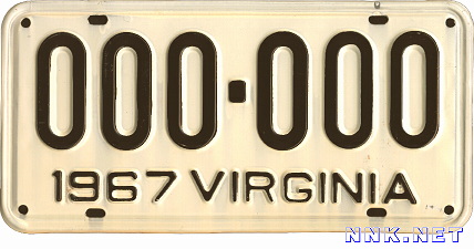 REFERENCE NUMBER: VA-1967FIRST YEAR OF ISSUE: 1967 PLATE TYPE: GENERAL ISSUE BASE MATERIAL: STEEL REFLECTORIZATION: NON-REFLECTIVE VALIDATION: 2 DECALS ON THE PLATE NOTES: BLACK SERIAL ON WHITE BASE
