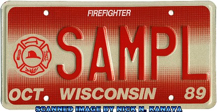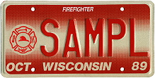 FIRST YEAR OF ISSUE: 1989 PLATE TYPE: OPTIONAL ISSUE BASE MATERIAL: ALUMINUM REFLECTORIZATION: PARTIAL - BACKGROUND ONLY VALIDATION: 1 OR 2 DECAL(S) ON REAR PLATE NOTES: ISSUED TO FIREFIGHTERS