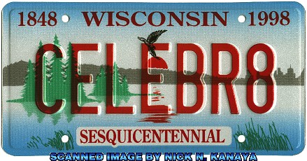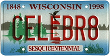 FIRST YEAR OF ISSUE: 1997 PLATE TYPE: OPTIONAL ISSUE BASE MATERIAL: ALUMINUM REFLECTORIZATION: PARTIAL - BACKGROUND ONLY VALIDATION: 2 DECALS ON REAR PLATE NOTES: WISCONSIN SESQUICENTENNIAL